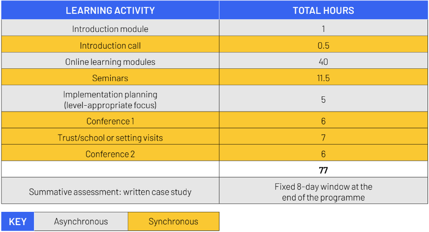 For NPQSL, NPQH, NPQEYL, NPQEL and NPQSENCO, you’ll take part in the following learning activities over a period of 18 months before completing your summative assessment: