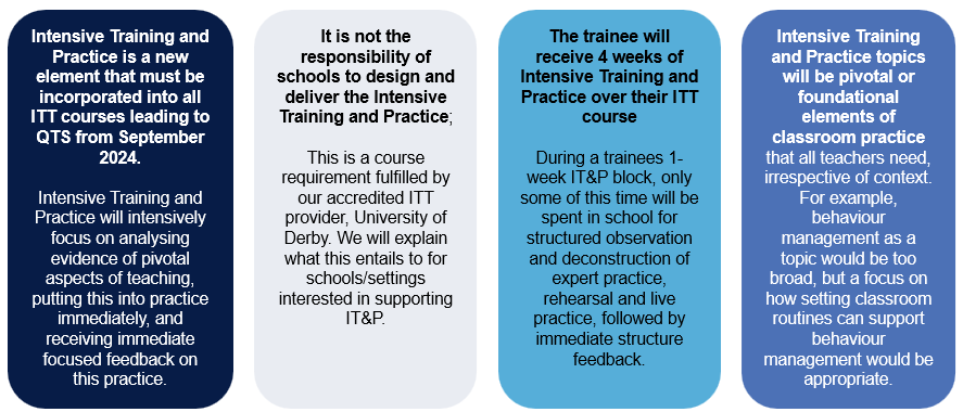 Intensive Training and Practice is not part of the ITT placement, although placement schools may wish to support Intensive Training and Practice too.