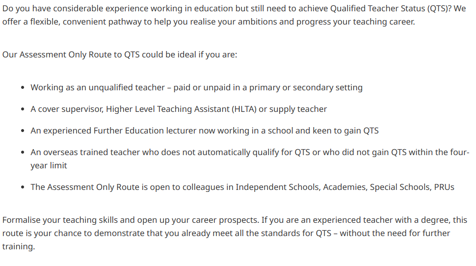 We are working in collaboration with the University of Derby to support schools with accessing the Assessment Only route to QTS.