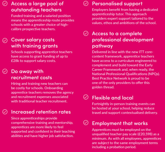 We are working in collaboration with Best Practice Network (BPN) to support schools with accessing Postgraduate Teacher Apprenticeships.